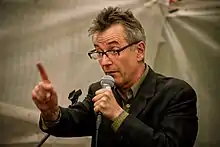 Hegley began his performing career at London's Comedy Store in 1980, and toured as one half of The Brown Paper Bag Brothers with Otiz Cannelloni.[5] He received national exposure when he appeared with his backing band the Popticians on Carrott's Lib in 1983, and recorded two sessions for John Peel in 1983 and 1984.[6] Hegley published his first poetry collection, Visions of the Bone Idol (Poems about Dogs and Glasses), pieces from which were later incorporated into Glad to Wear Glasses, in 1984. Hegley has written a number of collections of poetry, ranging from the surreal through the humorous to the personal and emotional. There are a number of recurring themes in his poems, notably glasses, dogs and reminiscences of his childhood in Luton.[7]