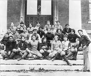 Although he was a drama student, he confessed he was "football mad". He played varsity football for Titusville High School from 1884 to 1886.[6] Heisman's father refused to watch him play at Titusville, calling football "bestial".[8] Heisman went on to play football as a lineman at Brown University[9] and at the University of Pennsylvania.[10][11][12] He also played baseball at Penn.[13]