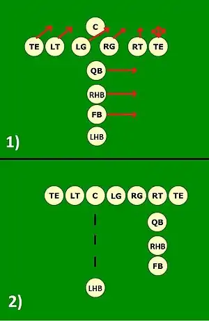 The 1906 Georgia Tech team beat Auburn for the first time, and in a loss to Sewanee first used Heisman's jump shift offense, which became known as the Heisman shift.[130][131] In the jump shift, all but the center may shift into various formations, with a jump before the snap. A play started with only the center on the line of scrimmage. The backfield would be in a vertical line, as if in an I-formation with an extra halfback, or a giant T. After the shift, a split second elapsed, and then the ball was snapped.[132] In one common instance of the jump shift, the line shifted to put the center between guard and tackle. The three backs nearest the line of scrimmage would shift all to one side, and the center snapped it to the tailback.[133]