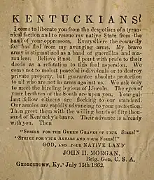 In his first Kentucky raid, Morgan left Knoxville on July 4, 1862, with almost 900 men and, in three weeks, swept through Kentucky, deep in the rear of Major General Don Carlos Buell's army. He reported the capture of 1,200 U.S. soldiers, whom he paroled, acquired several hundred horses, and destroyed massive quantities of supplies.[7] He unnerved Kentucky's U.S. military government and President Abraham Lincoln received so many frantic appeals for help that he complained that "they are having a stampede in Kentucky." Historian Kenneth W. Noe wrote that Morgan's feat "in many ways surpassed J. E. B. Stuart's celebrated 'Ride around McClellan' and the Army of the Potomac the previous spring." The success of Morgan's raid was one of the key reasons that the Confederate Heartland Offensive of Braxton Bragg and Edmund Kirby Smith was launched later that fall, assuming that tens of thousands of Kentuckians would enlist in the Confederate Army if they invaded the state.[8]