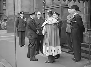 Falconer began his civic career in 1932 with his election to the Town Council in Edinburgh.[2] In 1935 he was elected Magistrate of the body, becoming its Treasurer in 1940.[2] In 1938 he lost by one vote in an election to become the Progressive Party's candidate for Lord Provost of Edinburgh.[2] During World War II he served as the Chief Air Raid Warden for Edinburgh, with the responsibility for raising the city's Civil Defence plans to war time efficiency.[2] In 1944 Falconer was again put forward as the Progressive Party's candidate for Lord Provost, this time winning the position.[5] On 10 November 1944 Falconer was sworn in as Lord Provost of Edinburgh.[5]