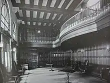 John Jay Hall was notably distinct from its institutional contemporaries on Morningside Heights. Johnson (now Wien) and Hewitt Halls were built to house female Columbia graduate students and Barnard College undergraduates, respectively. Both employed lighter wood finishing and "early-American" neo-colonial architecture, thought to reflect the comfortable, domestic environment women ought to be exposed to. In contrast, John Jay Hall featured dark wooden ceiling beams and panelling, as well as other details thought to render it a more "masculine" structure.[1]