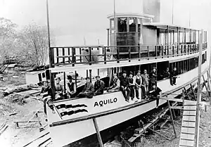 The Alaska-Yukon-Pacific Exposition was planned for the summer of 1909. Importantly for John Anderson, the "water gate" of the Exposition grounds was a pier on Union Bay in Lake Washington. Anderson secured exclusive access to this pier, the only one on the Exposition grounds. Two competitors, the Interlaken and Laurelhurst Steamship Companies, arranged to use a dock nearby.[48] Transporting tourists to the Exposition and lake excursions by visitors at the Exposition were business opportunities that exceeded the capacity of the Anderson Steamboat Company fleet. Captain Anderson built two more ships, Triton and Aquilo, both of which launched in May 1909, just in time for the Exposition's opening in June.[49] The crowds were huge, over 3 million visitors before the end of the event. Anderson's ships were packed. In fact, Aquilo was fined for exceeding her licensed passenger capacity on opening day.[50]