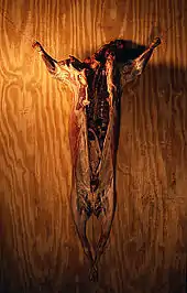 Inspired by the early work of Francis Bacon and the painting of a slaughtered ox by Rembrandt, he made a “meat series”, 198687. An example of this is the 1987 sculpture, This is my Body this is my Blood, consisting of a cut open decapitated lamb carcass, nailed to a piece of plywood.[4] His 1987 sculpture, Wind pipe, was a double bed with a varnished sewer pipe on it.