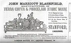 In 1859 terracotta production was transferred from London to Stamford, Lincolnshire, in order to exploit the local Jurassic clays, which were particularly suitable for terracotta production.[11] The Wharf Road works were considerably larger than Blashfield's London premises and in the 1861 census he was calling himself 'Terra Cotta Manufacturer and Pottery Company and was employing 46 Men and 13 Boys.[12] Most of the clay he used was from brickyards in the vicinity of Stamford at Wakerley, and Uffington, and Lower Estuarine clays from St Martin's, Stamford, but he still imported some Ball clays via Poole in Dorset and elsewhere from clay pits near the south coast.[13]