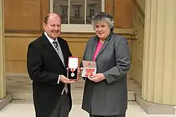 ![]() Sir John McCanny (left) and Sally Wheeler at their Knighthood/OBE investitures on 16 June 2017 | |