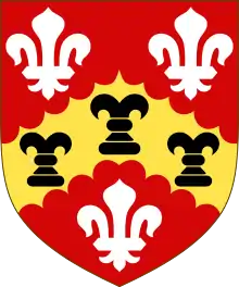 Mynne's coat of arms was "Gules, on a chevron engrailed Or between three fleurs de lis Argent, three chessrooks Sable".[3]