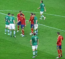 O'Shea was scheduled to face Spain on 11 June 2013 at Yankee Stadium in New York, but was ruled out of the game over the sudden death of his uncle Jimmy O'Leary.[44] On 14 October 2014, on his 100th cap, O'Shea scored the equalising goal with the last kick of the match, in a 1–1 draw against Germany at Gelsenkirchen, in a UEFA Euro 2016 qualifying match.[45] In the final qualifier, a 2–1 defeat away to Poland on 11 October 2015, he was sent off for a foul on Robert Lewandowski and thus missed the first leg of the Republic's play-off.[46]