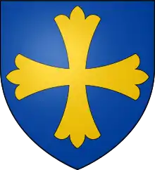 Arms of John Paveley: Azure, a cross patoncée or, as depicted in St John's Gate, Clerkenwell.[1] These were also the arms used by the Paveley family of Broke in Wiltshire, whose heir was the Cheney family and subsequently Robert Willoughby, 1st Baron Willoughby de Broke (d.1502), who quartered the Paveley arms. The Paveley Rudder was a heraldic badge used by the Paveley family,[6] later adopted by the Cheneys (it survives in its earliest manifestation sculpted on the monument in Edington Priory Church to Sir Ralph Cheney (d.1401) of Broke,[7]) and by the 1st Baron.