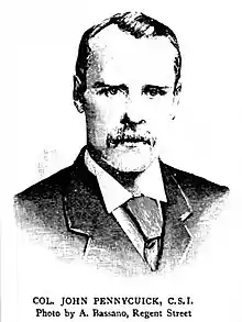 Pennycuick entered the East India Company Military College at Addiscombe, Surrey, in 1857, and was commissioned as a lieutenant in the Madras Engineer Group in December 1858.[1][2] He arrived in India on 11 November 1860. He became a Second Captain on 15 October 1870;[3] and a major on 8 December 1876.[4] He commanded H company at Zoulla during the Abyssinian campaign of 1868.[5] He received a medal for his participation in the expedition. On 10 October 1895 the Queen nominated him a Companion of the Order of the Star of India.[6] He served in the Public Works Department till January 1896. During his six years of service in the PWD, Pennycuick served as Chief Engineer in the construction of the Mullaperiyar Dam.