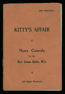 Quine was also the author of a comic play entitled Kitty's Affair. It was written in the Anglo-Manx dialect and it features a number of Manx types, including smugglers, farmers and maids. It was published in 1909 and received performances by several companies on the island.[2]