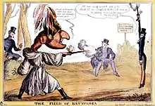 The Field of Battersea, caricature by William Heath of the 1829 duel between Arthur Wellesley, 1st Duke of Wellington (as lobster) and George Finch-Hatton, 10th Earl of Winchilsea; John Robert Hume, as the Duke's friend and physician, sits and spectates.