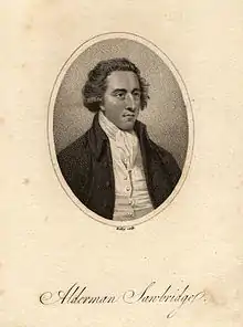 Sawbridge was elected as a Member of Parliament (MP) for Hythe at the 1768 general election,[2] and held the seat until 1774.[3] He exerted himself in the House of Commons on behalf of John Wilkes, who had been declared incapable of sitting for Middlesex. With John Horne Tooke, James Townsend, Richard Oliver, and others, he helped to form the Supporters of the Bill of Rights. In local politics Sawbridge, who was a liveryman of the Framework Knitters' Company, was elected, with Townsend, as sheriff of London in summer 1768, and in the following year (1 July) he was elected alderman for the ward of Langbourn. During his shrievalty he five times returned Wilkes as duly elected for Middlesex, in defiance of the house, and was threatened with a bill of pains and penalties from the government. In August 1771 Junius, in secret correspondence with Wilkes, urged him to procure Sawbridge's election as lord mayor; but Brass Crosby was reported to want re-election, and Wilkes, who had by the quarrelled with Sawbridge, refused to desert Crosby. At the election the show of hands was declared in favour of Sawbridge and Crosby, but a poll was demanded for four other candidates, Bankes, Nash, Hallifax, and Townsend. In spite of Junius's appeals, the livery returned Nash and Sawbridge to the court of aldermen. The former, the ministerial candidate, was elected Lord Mayor.[4]