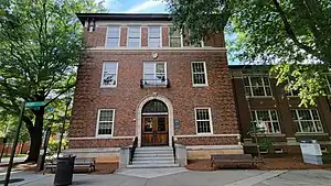 The John Saylor Coon building was built in 5 stages from 1912 through 1938, and it was designed by Francis Palmer Smith who was the head of the school's architecture department.[10][11] It was originally called the New Shop Building since it served as the home for shops and the mechanical engineering department.[10] The Coon building is the oldest building on campus currently used for academics.[10][12] The building is located on the western boundary of the Georgia Institute of Technology Historic District on Cherry Street across from Tech Tower, and it is included in the 12-building area listed on the National Register of Historic Places.[10]
