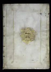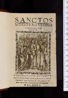 Beyond manuscripts, the Selden collection contains several notable printed works. Among them is the first book ever printed in Japan using moveable type, Sanctos no gosagueo no uchi nuqigaqi (Arch.b.f.69).[43] The printed books included in the Selden collection contain many that are significant in part because they originated in the libraries of other famous figures, including Sir Robert Cotton, John Donne, and John Dee.[43] According to Geoffrey Keynes, several of the books Selden received from John Donne's library include inscriptions from both men. One such book is Theodorus Beza's Tractatio de polygamia, which includes Donne's signature and motto ("Per Rachel ho servitor, & non per Lea"), as well as Selden's motto ("περί παντός τήν έλευθερίαν", "Freedom above all things").[49][50]