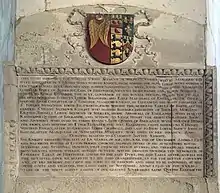 His monument in Great Bedwyn church consists of a chest tomb displaying heraldic escutcheons, surmounted by his recumbent effigy, fully dressed in armour with hands in prayer, his head resting on his helm from which projects the sculpted Seymour crest of a pair of wings. His feet rest on a lion, and a sword lies by his side.[39] On the wall above is a tablet inscribed as follows:[40]