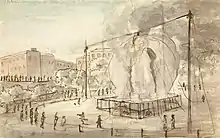Vincent Lunardi made the first ascent in England, on 15 September 1784; and on 25 September Sheldon again tried with his own Montgolfier balloon from Foley House, Portland Place, London. The balloon caught fire, and Sheldon with his companion Keegan were unable to get off the ground.[9] This attempted ascent was then the subject of a caricature by Paul Sandby.[1]