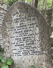 Prout died at Kentish Town, London, on 29 August 1876[1] and was buried in a family grave on the eastern side of Highgate Cemetery.