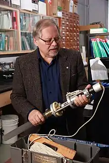 ![]() John Smol holding a Glew lake sediment corer in his lab at Queen`s University | |