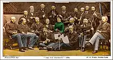 Group of musicians (including John Stainer) that performed Haydn's Toy Symphony at St. James Hall, on behalf of a charity, 1880 - Sir Arthur Sullivan is on the first row sitting on the floor.