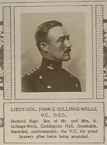 Lieutenant-Colonel John Stanhope Collings-Wells VC DSO (19 July 1880 – 27 March 1918) was an English recipient of the Victoria Cross, the highest and most prestigious award for gallantry in the face of the enemy that can be awarded to British and Commonwealth forces. He was educated at Uppingham School and Christ Church, Oxford, where he joined the Apollo University Lodge.[2]