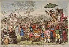 Thelwall's career as an editor and journalist was quite successful, but the highlight of this period was his political activism. In the wake of the French Revolution, he became "intoxicated in the French doctrines of the day".[3] He started to hold talks in London's radical societies and, having made acquaintance with fellow radical John Horne Tooke, and in 1792 co-founded the federation of radical clubs and societies, the London Corresponding Society.