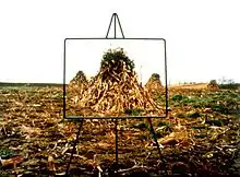 Van Alstine's photographs ask knowing questions about sentiment, perception, and the history of art.[14] Created in the late 1970s early 1980s when Van Alstine was in the western U.S., the Easel Landscape Series was a site-specific installation project designed to question and examine the accepted convention of frame as "signal" or "sanctioning" device for art. The series takes clues from many sources, including the "on site" plein air paintings of Claude Monet, such as the Haystack or Cathedral series, and surrealist René Magritte in paintings like The Promenades of Euclid, where Magritte presents the viewer with the image of a painted canvas on an easel simultaneously in front of a window while acting as a window.[12]