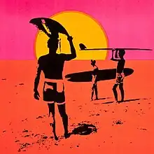 In 1964, John Van Hamersveld was a student at the Art Center College of Design and the art director of Surfing Illustrated magazine and Surfer magazine. Van Hamersveld was also a local surfer and was hired by director and filmmaker Bruce Brown to design the iconic Endless Summer movie poster using a photograph taken by Bob Bagley, general manager and cameraman for Bruce Brown Films.[6] To produce the image that would become iconic, he organized a photo session with the producer and the two stars at Salt Creek Beach in Dana Point. Using photo techniques for the central image and hand-lettering the title Van Hamersveld created a “national phenomenon” image that has endured as a classic. He was paid $150 for the art. The poster is featured in the National Museum of American History section of the Smithsonian Institution, The Museum of Modern Art, and The Los Angeles County Museum of Art.[7]