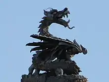 After the death of J W Singer in 1904 at Knoll House[40] in Gentle Street,[41] his two sons, Herbert and Edgar took charge of the firm, under the continuing and colourful chairmanship of William Bull. The statuary work continued, including noteworthy castings: Thornycroft's "Gladstone" in the Strand,[42] Pomeroy's "Justice" on the Old Bailey, Fehr's fantastical Welsh Dragon on the top of Cardiff's City Hall and eight large lions for the Cecil Rhodes Memorial in Cape Town, South Africa. 150 lion's head bronze mooring rings, designed by Gilbert Bayes, were installed in 1910 along the Thames Embankment beside the County Hall.[43] Other works include "Hampden" in Aylesbury (1912) marking the Civil War,[44] and gates at the Bowes Museum[45] and Cliveden.[46][47]
