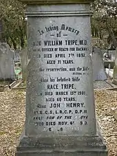 Tripe was born in London in 1821, one of 11 children born to Mary née Broad (1795–1874) and Dr John Tripe (1789–1841). He was educated at the Merchant Taylor's School before studying medicine at the London Hospital, where he was awarded two gold medals. He became a Licentiate of the Worshipful Society of Apothecaries (LSA) in 1843 before making further studies in medicine at the University of St Andrews from where he graduated as a Doctor of Medicine in 1846. He became MRCS (England) in 1848 and MRCP (Edinburgh) in 1879. He became a Licentiate in Midwifery (LM) in 1853.[1] Tripe was Medical Officer of Health for Hackney from 1856 to his death in 1892. He married Elizabeth Thomson on 10 October 1850;[2] she died in 1860. In 1864 he married Grace Wright (1841–1901),[3] with whom he had two children: Mary Grace Tripe (1870–1941) and John Henry Tripe (1874–1913), who, like his father and grandfather, became a doctor.
