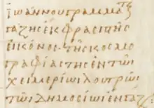 Seven poems by John have survived: an ekphrasis and six Anacreontic verses.[5] The ekphrasis, Tabula Mundi (Table of the World), contains 703 hexameters and an iambic prologue in epic language in the style of Nonnus of Panopolis.[3][5] It survives only in the Paris fragment of the single manuscript of the Palatine Anthology, in which it is given the title Description of a Picture of the World Situated in the Winter Baths.[lower-alpha 1] This is not the original title of the work, which is better known as the Tabula Mundi,[lower-alpha 2] a purely conventional title.[7]