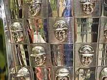 Johnnie Parsons had the dubious distinction of being the only Indianapolis 500 winner to have his name misspelled on the Borg-Warner Trophy. The silversmith engraved "Johnny" instead of "Johnnie." He had a son named Johnny who competed at Indy a dozen times. Evidence of the engraver's mistake can be seen in MGM’s production, To Please a Lady (1950). When the camera pans across Johnnie Parsons' name and bust relief, while they’re doing a brief segment on the trophy, his misspelled name is revealed.[5] In 1991, during a trophy restoration project, it was proposed to correct the spelling, albeit posthumously. However, it was decided to keep the error intact, as part of the trophy's lore.