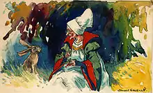 As Gruelle earned notoriety as a cartoonist for the Herald, he also pursued writing and illustrating his own fairy tales. His first major illustrating commission was a single-volume edition of Grimm's Fairy Tales (1914) that included Gruelle's artwork for eleven full-color plates. In other early commission work he illustrated and retold other fairy tales that included the stories of "Cinderella," "Little Red Riding Hood," and "Hansel and Gretel," among others. He also wrote and illustrated My Very Own Fairy Stories (1917), published by P. F. Volland Company, a publisher of inspirational cards, gifts, and books.[29] Beginning with these early stories, Gruelle typically used a "fairy-story-with-a-moral format" to teach the ethical lessons that became a trademark of his work.[19] Gruelle also created a cartoon series in 1917 called Quacky Doodles, produced as part of Bray Productions' weekly Paramount Pictograph productions.[30]