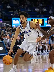During the offseason, Juzang declared for the NBA draft while maintaining his college eligibility.[37] After making it into the first round of some mock drafts but also struggling in a few draft combine games, he decided to return to UCLA and contend for a national championship in 2021–22.[38] Hoping to boost his draft stock, Juzang instead fought injuries,[39] missing one game due to a sore hip from a scooter accident and two others with a sprained right ankle.[40][41] He was also sidelined for two games after testing positive for COVID-19,[42] and failed to significantly improve on defense during the season.[39] Though he was the focus of opponents' defensive game plans, Juzang largely duplicated his statistics from a year before and remained as UCLA's leading scorer,[33] helping lead the team to a No. 4 seed in the 2022 NCAA tournament.[43] He was named a third-team All-American by the National Association of Basketball Coaches,[44] and was voted to the All-Pac-12 first team.[45] He was also listed on the final national ballot for the John R. Wooden Award,[46] and was a finalist for the Jerry West Award, given to the top shooting guard in the nation.[47] After failing to reach double figures in scoring in four out of six games,[48] Juzang had his best game since his ankle injury with 14 points on 6-of-11 shooting along with eight rebounds in a 72–56 win over Saint Mary's in the second round of the NCAA tournament.[49] He scored 14 again in the Bruins' season-ending 73–66 loss to North Carolina in the Sweet Sixteen, but needed 13 shots and was only 2-of-8 shooting in the second half.[50] After the season, he left UCLA to enter the NBA draft.[51]