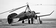 Kellett had obtained a licence to produce Pitcairn autogyros, and asked Miller to be the test pilot for his new wingless version, the two-seat KD-1. The D in the name stood for Direct control, meaning that the rotor was responsible for all aerodynamic control, so that ailerons (and therefore the wings), elevators and indeed airspeed were no longer required.[25] Other test pilots had declined to fly it, fearing for the safety of the aircraft, but Miller, thoroughly understanding the principles involved, was convinced that the radical new design would be safe, and accepted Kellett's offer. The testing went well, Miller even becoming the first pilot to dive an autogyro – the advancing rotors went near-supersonic and caused severe problems for Miller, but he survived, shaken but unscathed, and the aircraft sustained only minor damage, mainly to the rotor blades. The inspector who had asked for this test then declined to pass the aircraft but Miller told him that any aircraft subject to that level of abuse where it and the pilot both survived was obviously worthy of a certificate, and the inspector agreed.[6]