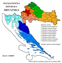 Communities of Municipalities in 1986 in Socialist Croatia (colored differently).
