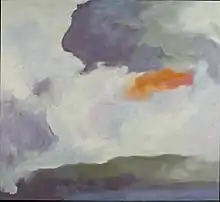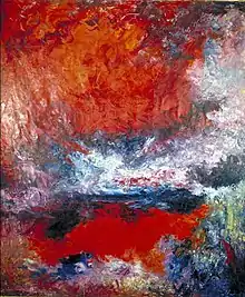 Schueler's early painting, exhibited at his 1954 Stable Gallery solo show, evoked nature's atmospheric and rhythmic force.[12] By the time of Schueler's 1957 Leo Castelli Gallery exhibition, however "glimmers of fantasy sea and sky, storm and fog, sun and land," set his work apart from mainstream Abstract Expressionism.[7][13] Like other artists searching "for the uniqueness of their souls on the canvas,"[5] Schueler traveled to Europe where he discovered his imagined landscapes in Mallaig, Scotland. Back in New York in 1959, his memories of Mallaig took on mystical significance as "dimly recognizable forms of real landscapes with glimpses of the horizon and receding distances."[14] Writer B. H. Friedman recalled that his work, now painted with brushes rather than palette knives, "contained a luminosity and a glow of radiant light not found previously."[3] In 1970 Schueler wrote that his painting "must be a search and a requiem" and his work began to reflect a "less tempestuous awareness of natural elements."[3] Art reviewer Janet McKenzie noted the influence of J. M. W. Turner and a "more poetic and elemental meaning" in his work as his wartime memories receded.[3] In 1975 Whitney Museum of American Art director John I. H. Baur praised Schueler's work: "They strike a more precarious balance between observation and abstract form than do most paintings that try to wed the two...."[3] Schueler himself commented in 1984: "The abstract is real and the real is abstract."[5] The palette in his later work varied from subtle and pale tones to vibrant, almost aggressive red, yellow, and black, which took on the fluidity or restlessness of ambient light.[15] By the late 1980s, his paintings were rendered with increasingly loose brushstrokes, which at times recalled his early work.[16]