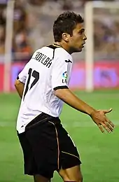 After returning to Los Che, Alba made his La Liga debut on 13 September 2009, in a 4–2 win at Real Valladolid.[11] He then started in two consecutive UEFA Europa League group stage matches, against Lille and Slavia Prague (both 1–1 draws, respectively away and home).[12][13] Due to continuing injuries in Valencia's defence, he played much of 2009–10 as a left-back, posting overall good performances. In that position, on 11 April 2010, he scored his first goal for the club, in a 2–3 away loss to Mallorca.[14]