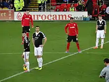 Mutch's first start came in "an experimental Birmingham line-up" in the third-round FA Cup-tie at Millwall;he played the full 90 minutes in a 4–1 win.[25] He made his Premier League debut on 22 January 2011, replacing the rested Craig Gardner ahead of the League Cup semi-final second leg, and again played the whole match as Birmingham lost 5–0 at Manchester United.[26] A few days later, he signed a three-year extension to his contract, which had been due to expire at the end of the season.[27] His second Premier League match, at Everton in March, was eventful. With Gardner, Barry Ferguson and Keith Fahey all injured, Mutch started the game in central midfield. After 17 minutes, Jean Beausejour opened the scoring with a header from Mutch's lofted cross. When referee Peter Walton attempted to caution the player for a foul on Louis Saha, he found himself without yellow cards, so showed the player an imaginary card instead. Near the end of the game, Mutch threw his body in the way of a Saha shot to prevent Everton taking the lead.[28]