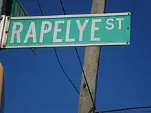 Brooklyn's Rapelye Street is named for the family. The spelling of the Rapelje family name varied over the years to include Rapelye, Rapalje, Rapareilliet, Raparlié, Rapalyea, Raplee, Rapelyea, Rapeleye, Rappleyea as well as others.[6]