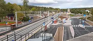 Jorvas railway station is a railway halt on the Helsinki Commuter Rail network located in the town of Kirkkonummi, Finland, between the Masala and Tolsa stations. The station is served by Helsinki Commuter Rail lines L, U and X. The train station has two staggered platforms. Westbound trains to Kirkkonummi use track one, while eastbound trains to Helsinki use track two.