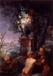 Vase of Flowers with Children Playing in the Water