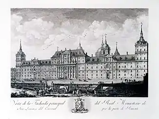 His culminating work is the Collection of Different Views of the Magnificent Temple and Royal Monastery of San Lorenzo de El Escorial, Factory of the Catholic and Prudent King Felipe II, built by the Distinguished Architects Juan Bautista de Toledo and Juan de Herrera his Disciple , which he undertook on his own initiative. In a letter addressed to the Academia in 1800, he noted that he was short of work and, pursuing his fondness for drawing, spent the summer sketching at El Escorial.[4] King Charles IV was so pleased with them, he commissioned more, depicting Aranjuez, and provided an annual pension of 300 ducats. Possibly due to failing eyesight or other health issues, the actual engravings were executed by Tomás López Enguídanos and Manuel Alegre.[4]