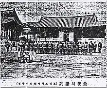 On July 31, 1907, when the struggle for national sovereignty was at its peak, the newly enthroned emperor issued a decree regarding the dissolution of the military. As a result, many generals dispersed instantly, and the Korean Empire became a "powerless" country.[1] The army disbanded on August 1, 1907, as per the Japan–Korea Treaty of 1907. From midnight, it rained in Seoul. There was an order to gather in Namdaemun. In Namdaemun, Major Park Seung-hwan committed suicide out of guilt for not protecting the country. His death incited the Korean Army to loot their armories, which the Japanese confiscated earlier, and fight against the Japanese army, beginning the Battle of Namdaemun. Still, the Japanese anticipated this and suppressed them after nearly four hours of fighting, in which 13 officers and 57 enlisted were killed. On August 30, 1907, many officers were removed from their positions. Emperor Sunjong incorporated the remaining soldiers into the Imperial Retinue Guard, which continued even after the annexation in 1910.[6][7][8] After disbanding the central army in 1907, the provincial armies gradually separated. As a result, the provincial soldiers joined the Righteous Armies before the disbandment.[9][3]