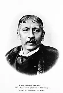 Renaut was born in La Haye-Descartes, Indre-et-Loire, and studied medicine from 1864, first at Tours and then in Paris. In 1869 he became an interne des hôpitaux and continued to study under Victor André Cornil and Louis-Antoine Ranvier. In 1874 he submitted a thesis on erysipelas and earned two medal in 1876 and then became director of the pathology laboratory at the Charité Hospital, Paris. In 1877 he became head of anatomy and histology at Lyons where he taught for forty years while also working at the Croix-Rousse, Perron, and Hôtel-Dieu hospitals. From 1889 to 1899 he worked on a treatise of histology, the Traité d’histologie pratique. Renaut described cylindrical and long hyaline structures in the subperineural spaces of peripheral nerves in horses and donkeys in 1881 and called them “système hyalin”, which are now called Renaut corpuscles (or bodies).[1][2][3]
