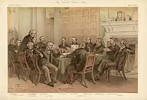 William Edward Forster, vice-president of the Committee of Council on Education, proposed an Elementary Education Bill in January 1870.[22] Nonconformists opposed the proposal to fund church schools as part of the national educational system through the rates. The NEL was angered by the absence of school commissions or of free, compulsory education. Chamberlain arranged for a delegation of 400 branch members and 46 MPs to visit the prime minister William Ewart Gladstone at 10 Downing Street on 9 March 1870, the first time the two men had met. Chamberlain impressed the Prime Minister with his lucid speech, and during the bill's second reading Gladstone agreed to make amendments that removed church schools from rate-payer control and granted them funding. Liberal MPs, exasperated at the compromises in the legislation, voted against the government, and the bill passed the House of Commons with support from the Conservatives. Chamberlain campaigned against the Act, and especially Clause 25, which gave school boards of England and Wales the power to pay the fees of poor children at voluntary schools, theoretically allowing them to fund church schools. The Education League stood in several by-elections against Liberal candidates who refused to support the repeal of Clause 25. In 1873 a Liberal majority was elected to the Birmingham School Board, with Chamberlain as chairman. Eventually, a compromise was reached with the church component of the school board agreeing to make payments from rate-payer's money only to schools associated with industrial education.[1]