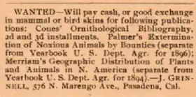 The Condor published classified ads which listed items to buy, sell or trade for other specimens, collections, guns, cameras or publications. Species and their eggs for sale or exchange included rare birds like the California condor and bald eagle.[24]