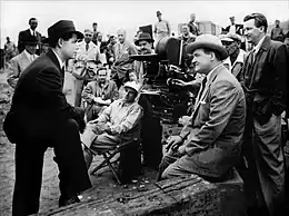 ![]() Lewis (seated center) with Glenn Ford (left) and Barry Kelley (seated right) on the set of The Undercover Man (1949) | |