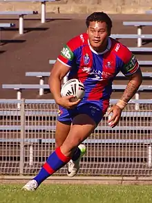 In January 2012, Leilua was named in the New South Wales Emerging Blues squad, pledging his allegiance to Australia.[11] On 22 April 2012, Leilua re-signed with the Roosters on a 2-year contract.[12] Leilua was described as "one of the best on field" NSW City in the annual City vs Country Origin match, playing centre in the 24–22 win at Mudgee.[13][14] In Game 1 of the 2012 State of Origin series, Leilua was named 19th man for the New South Wales team.[15] Leilua finished the 2012 NRL season with him playing in 19 matches and scoring 6 tries. At the end of the year, Leilua was again named in the New South Wales Emerging Blues squad.[16] In October 2012, Leilua was arrested after being accused of breaching an AVO, spitting on his ex-girlfriend, and distributing lewd photos of her.[17] He was released on $6000 bail. He was then placed on a one-year good behaviour bond after being found guilty of sending nude photos of his former girlfriend to her brother and a friend.[18] On 18 December 2012, Leilua was released from his Roosters contract due to disciplinary reasons.[19] On 22 December 2012, Leilua joined the Newcastle Knights.[20]