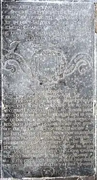 Prust was a staunch Royalist during the Civil War. His inscribed ledger stone survives in the floor of the Annery Chapel in Monkleigh Church and reveals that he was a Lt.Col. in the Regiment of Horse of Sir Thomas Stucley (d.1663) of Affeton Castle[6] and that he lost a hand during combat in the Civil War at Plymouth.[7] His ledger stone shows the following biographical inscription: